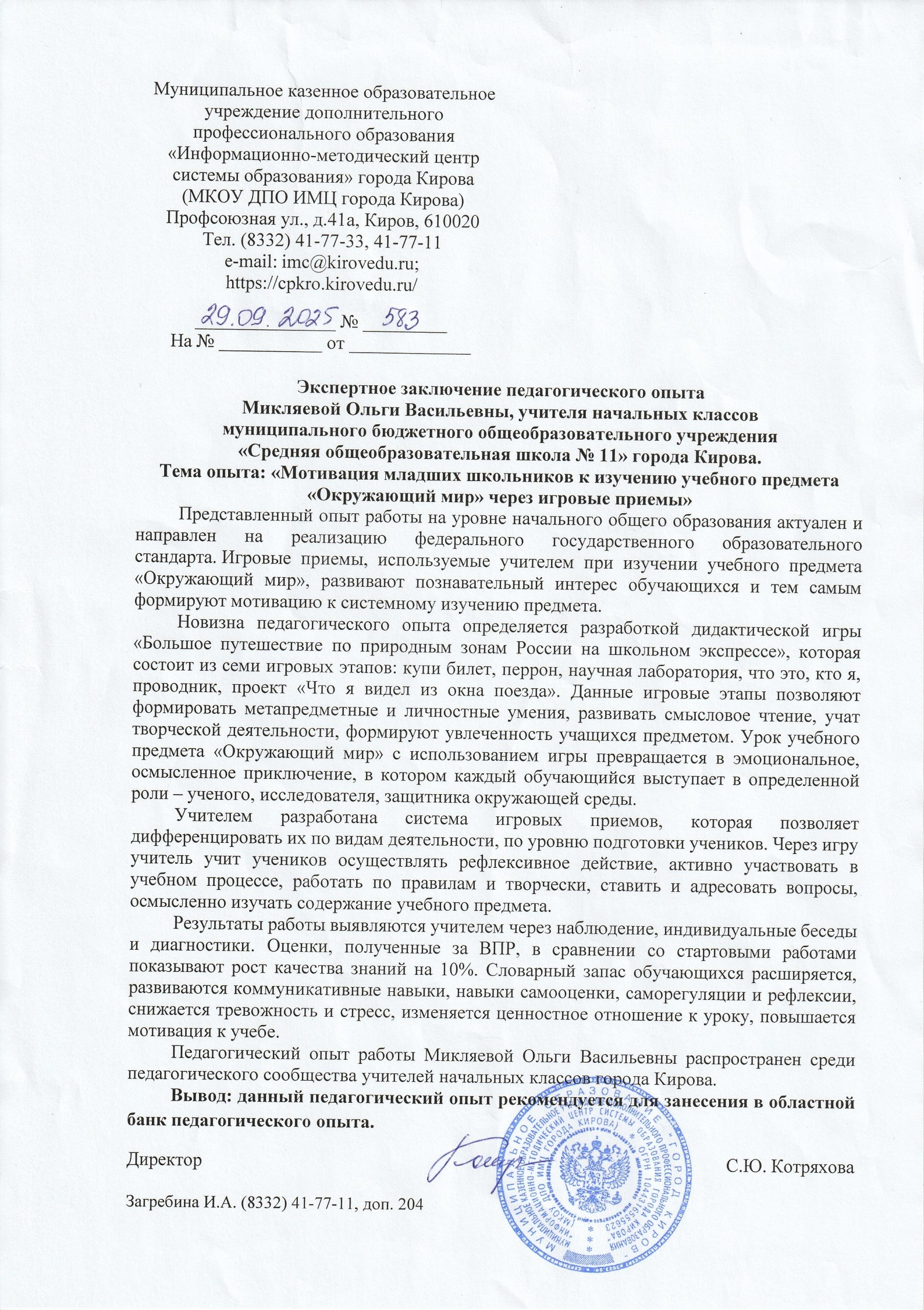 Ф.И.О. эксперта | Князева Л.А., методист кафедры ДиНОО КОГОАУ ДПО «ИРО Кировской области» |