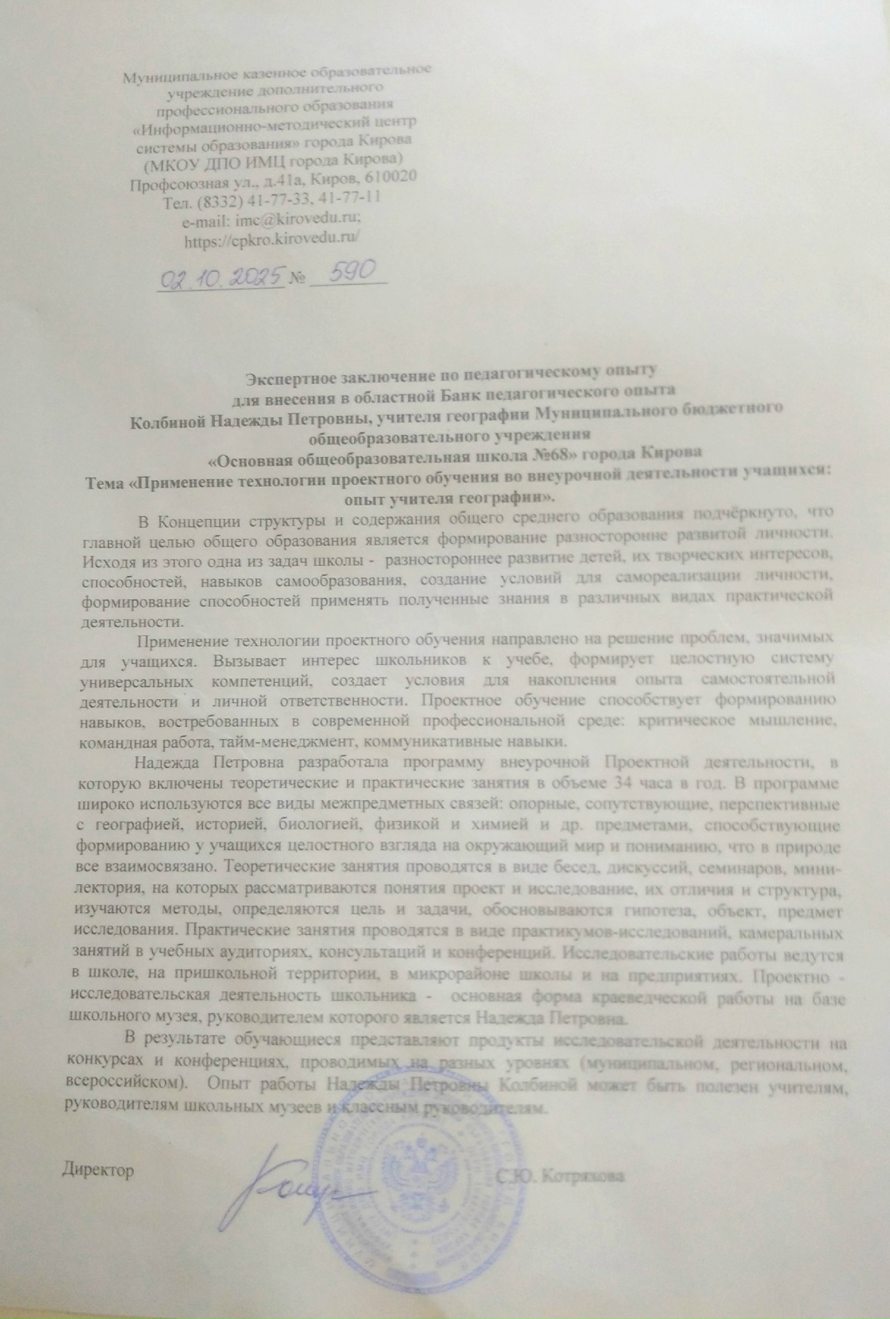 | Экспертное заключение | Представленный опыт работы Колбиной Н.П. по теме «Применение технологии проектного обучения во внеурочной деятельности учащихся: опыт учителя географии» отвечает требованиям регионального банка педагогического и управленческого опыта. |